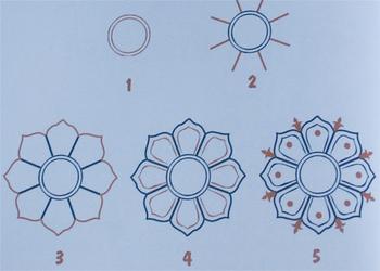 Az egymást követő lépésekben barna színnel van rajzolva az adott pontban megfestendő rész, feketével a már felfestett elem.